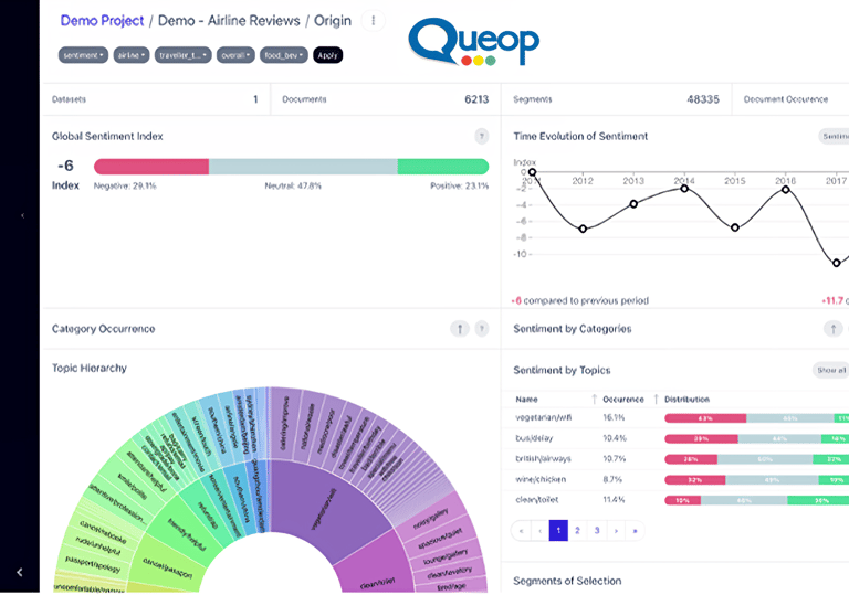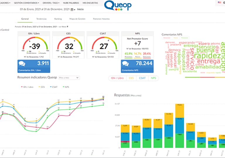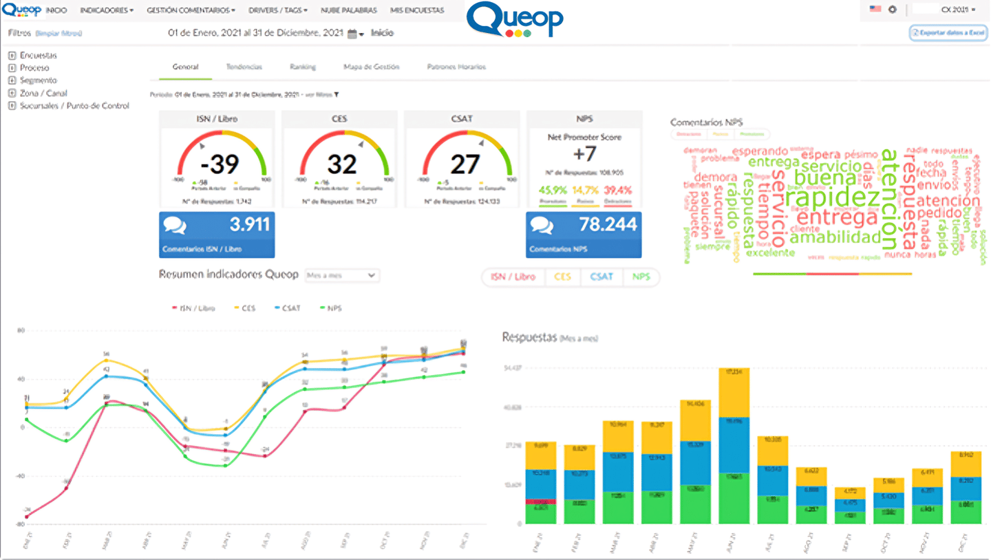 Con Queop tendrás toda la información relevante del feedback de tus clientes en un potente dashboard de reporting y gestión.