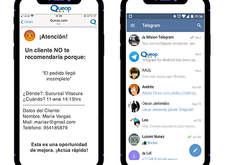 Con Queop podés saber inmediatamente cuando se produce un reclamo, recibiendo alarmas vía E-mail o Telegram configuradas para distintos perfiles de usuario y sucursal, etc.