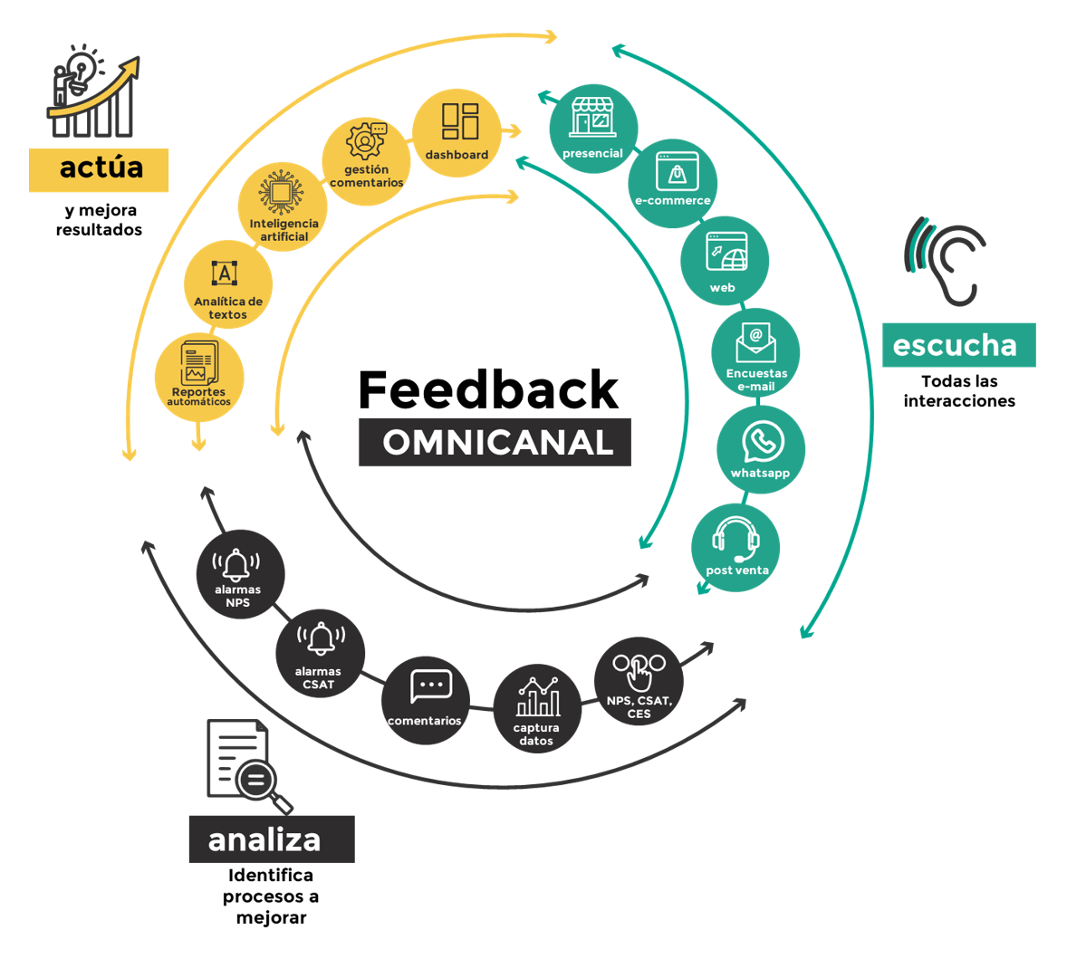 Capturá feedback en sucursales físicas y canales digitales con códigos QR, tablets en el local, WhatsApp, email y web.
